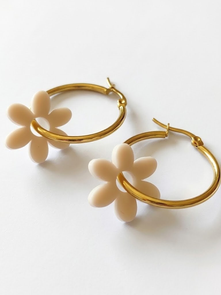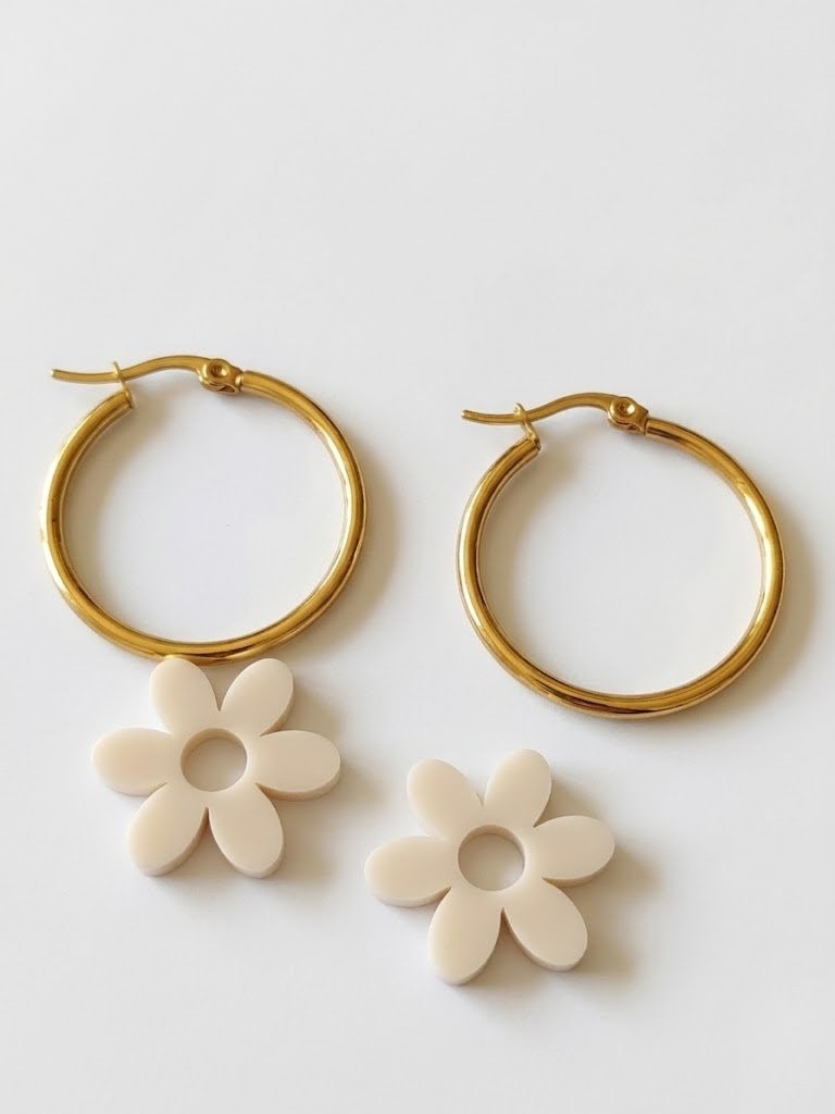 Unsere Daisy Dream Hoops sind die perfekte Kombination aus minimalistischer Eleganz und sommerlicher Frische. Der hochwertige, goldene Edelstahl-Creole trifft auf einen zarten, Pastell Nude Blumen-Charm. Das Besondere: Der Blumen-Charm ist abnehmbar! So hast du zwei verschiedene Looks: trage sie als schlichte, goldene Creolen oder füge die Blume für einen verspielten Retro-Sommer-Style hinzu. Perfekt für deinen Alltag oder als besonderes Geschenk.